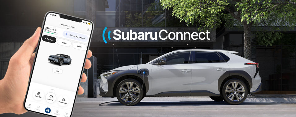Les propriétaires de Solterra utilisent l’appli SubaruConnectMC , disponible à partir des boutiques d’applis Apple et Google. L’appli SubaruConnectMC s’applique exclusivement à la Solterra. Pour les autres modèles Subaru, il convient d’utiliser l’appli MySubaru.